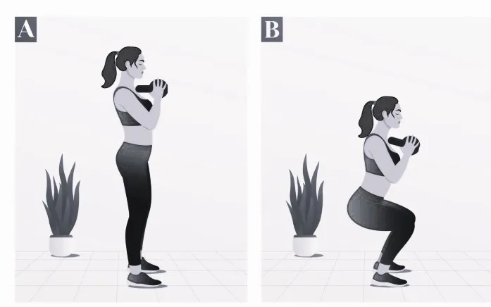 2) Приседания с утяжелением – гирей. Исходное положение: стоя, ноги на ширине бедер, спина прямая, гиря – в руках. Выполняем всё те же приседания, только с небольшим дополнительным весом. Выдох – при подъеме вверх. 3 подхода по 15-20 раз ( в зависимости от веса утяжелителя).