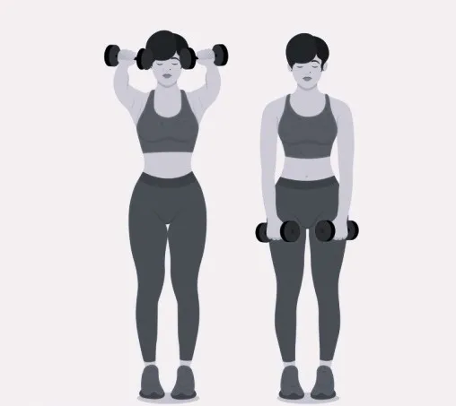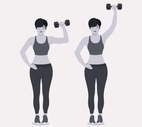 11) Жим гантели одной рукой. Это же упражнение мы рассматривали, когда разговаривали о фитнес-резинках. Исходное положение: стоя, ноги на ширине плеч, согнутая в локте рука держит гантель на уровне с головой. С выдохом поднимаем гантель вверх, на вытянутой руке. С вдохом возвращаемся в исходное положение. Это упражнение можно выполнять одновременно двумя руками. 3 подхода по 10-15 раз.