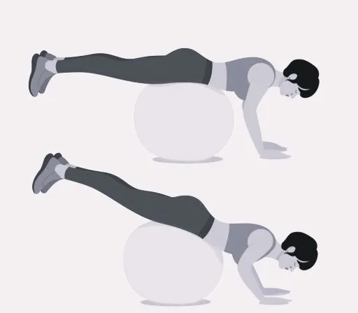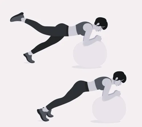 6) Планка на предплечьях на фитболе на одной ноге. Здесь всё предельно просто: встаем в планку, предплечья располагаются на фитболе. Поочередно поднимаем одну ногу, задерживаемся на несколько секунд, затем меняем ногу. 3-4 подхода по 5-12 раз.