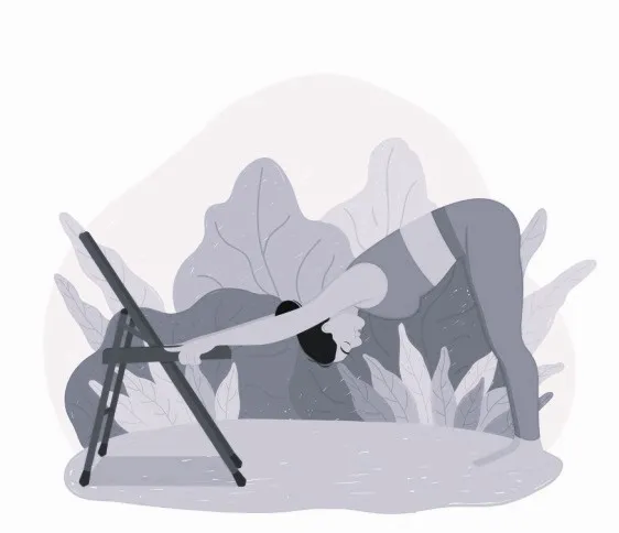 1) Растяжка спины с помощью стула. Встань так, как показано на картинке: ладонями опираемся о стул, руки вытянуты. Постарайся расслабиться и поглубже «провиснуть» на руках. Грудной клеткой стремимся вниз, к полу. Задержись в таком положении на 1 минуту.