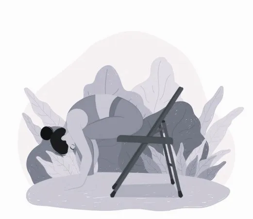 4) Расслабление и растяжка поясницы, сидя на стуле. Здесь всё очень просто: сидя на стуле, «ложимся» животом на бедра, свешиваем расслабленные руки вниз, как веревки, и расслабляемся в течение 2 минут.