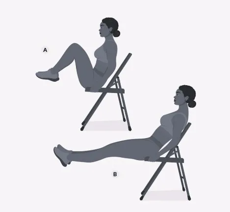 10) Упражнение на пресс и ноги, сидя на стуле. Исходное положение: сидя на краю стула, руками держась за него. Ноги согнуты в коленях, поближе к груди. С вдохом выпрямляем ноги, отклоняясь корпусом назад, с выдохом, подводим колени к груди. 3 подхода по 12-20 раз.