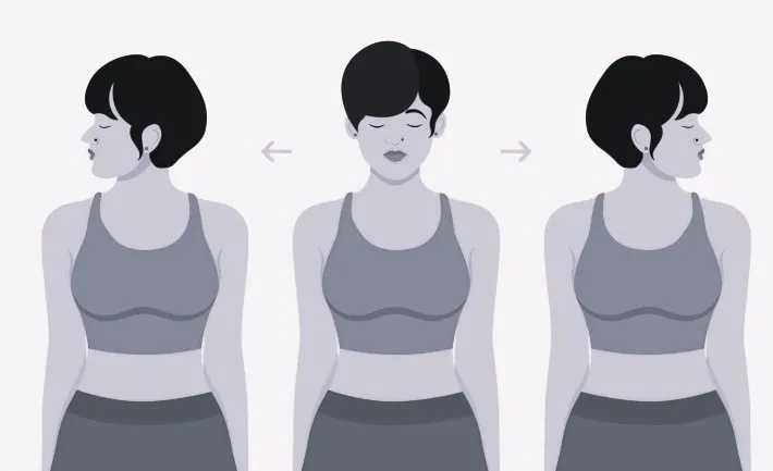 Растяжка боковых мышц шеи. Исх. положение: сидя с прямой спиной или сидя. Макушкой тянемся вверх, плечи опускаем вниз. Размещаем ладонь правой руки на левое ухо, наклоняем голову к правому плечу. Ладонью слегка усиливаем наклон. Задерживаемся на 20 секунд, затем меняем стороны. Никуда не поворачивай подбородок!