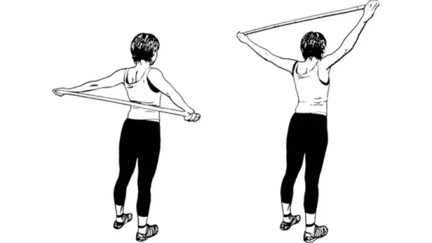Поднимаем палку над головой. (Плечи стараемся опускать вниз и не подводить к ушам)