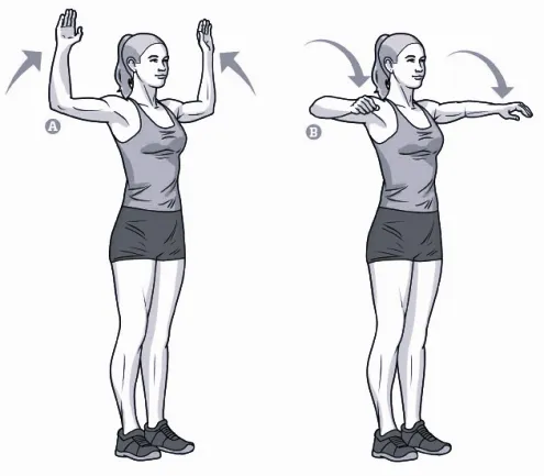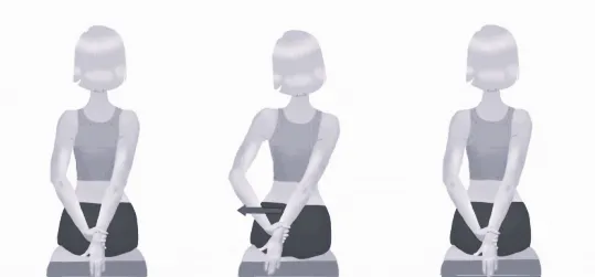 Сидя на стуле или табуретке, заводим больную руку за спину, насколько возможно. За спиной захватываем её здоровой рукой за запястье и тянем к противоположной ягодице. Задерживаемся на 5 секунд. Далее отпускаем. Повторить 6 раз с каждой рукой.