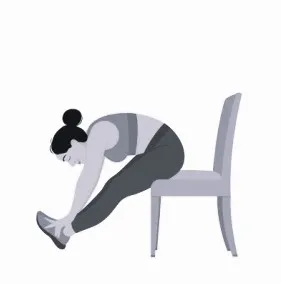 Садимся на стул с вытянутыми ногами. Скользящими движениями руками по ногам, с выдохом, наклоняемся вниз к ногам, стараясь дотянуться ладонями до стоп, затем такими же скользящими движениями, со вдохом, поднимаемся в исходное положение. Повторить 8 таких плавных движений.