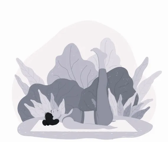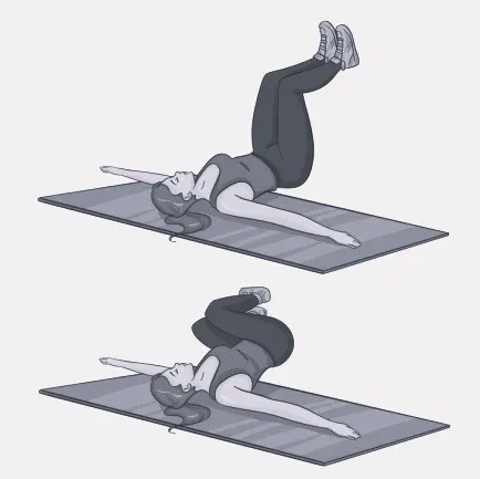 Следующее упражнение похоже на предыдущее, но оно статическое. Исходное положение: лежа на спине, руки в стороны на высоте плеч. Сначала согни правую ногу в колене, зацепись правой стопой за левую голень, затем опусти правое колено на пол с левой стороны, сохраняя “зацеп”. Плечи при этом остаются на полу. Задержись в таком положении 1 минуту, спокойно и ровно дыша, затем поменяй стороны.