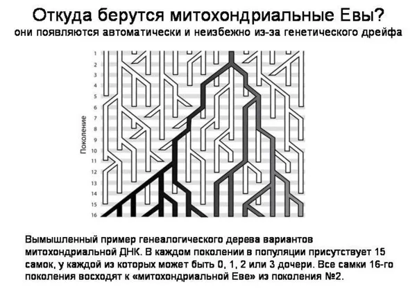 Допустим мы следим за дальнейшей судьбой этих 15-ти самок. Каждая самка в этой схеме рожает какое-то количество дочерей (сыновьями и мужьями здесь не занимамеся, поскольку рассматриваем передачу только митохондриальной ДНК, то есть по женской линии). В этой условной схеме (представленной на рисунке) каждая самка рожает от нуля до трёх дочерей, случайным образом. Так вот, этот чисто случайный процесс неизбежно приводит к тому, что рано или поздно в популяции останутся потомки только одной самки – и та самка, которой повезло, она и становится автоматически митохондриальной Евой. В данном случае все самки из 16-го поколения (внизу рисунка) восходят к одной самке из второго поколения».