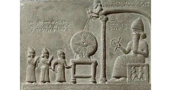 Шамаш и его солярный символ, в руке знак власти (аккадская печать, из статьи Википедии «Шамаш», Автор: http://altreligion.about.com/library/graphics/bl_ashur.htm, Общественное достояние, https://commons.wikimedia.org/w/index.php?curid=2739443)