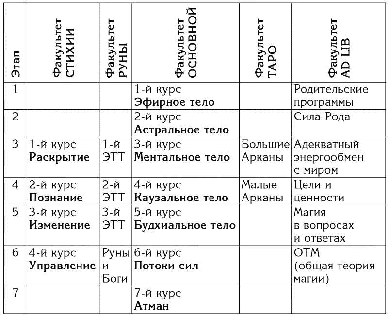 Обучение ведется по следующим направлениям: факультет Освобождения сознания, скандинавские Руны, Стихии, Таро, курс по Общей Теории Магии, занятия по Силе Рода, а также ряд тренингов различной тематики и выездные мистерии. Цель обучения в Школе – раскрытие и реализация природного потенциала человека, эволюция сознания, овладение техниками по изменению структуры сознания.