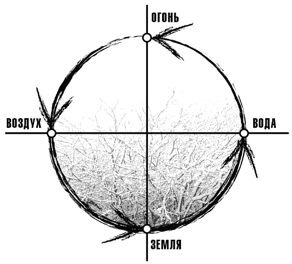 В первичном своём свойстве стихии формируют процесс бесконечного движения. Огонь стремится к Воздуху, потому что Воздух нужен Огню для воплощения своего базового свойства – экспансии. Воздух бежит от Огня, поскольку Огонь может его уничтожить. Его движение идёт туда, где он не будет заперт и уязвим для Огня: Воздуху нужен простор, и он находит его в стихии Земли. Земля опасается Воздуха, так как он способен высушить её, сделать неплодной. Поэтому Земля стремится к Воде, ибо Вода даст Земле силу для плодородия; влажная Земля может дольше воспринимать силу стихии Воздуха, не теряя своих сущностных свойств. Но Вода боится Земли, так как Земля способна поглотить Воду, впитать её в себя. Чтобы подняться над Землёй, уйти от неё, Воде нужен Огонь – он позволит Воде перейти в другое агрегатное состояние и обрести неуязвимость от поглощения. Но Огонь боится Воды: ведь Вода способна Огонь потушить. И Огонь бежит от Воды, ища источник своей силы в Воздухе. Процесс повторяется. Он бесконечен и основан на природном конфликте. Он бесконечен, потому что силы стихий этого уровня равны друг другу, они всегда равны, они не способны быть ни побеждёнными, ни победителями, и никогда не будет иначе.