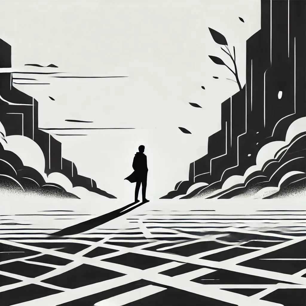 Представь себе человека, который идёт по лесу. Он движется вперёд, думая, что знает, куда направляется, но вдруг осознаёт, что все деревья вокруг одинаковы, и он не может понять, где находится. Он пытается найти дорогу обратно, но каждый шаг только усиливает его замешательство. Он начинает кружить на одном месте, попадая всё глубже в лес. Его тревога растёт, и с каждым кругом он всё больше теряет контроль над ситуацией.