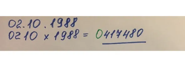 Перемножаем и записываем готовый результат: 210*1988 = 417480. Получилось число, состоящее из 6 знаков. В данном случае нам необходимо перед результатом добавить 0 (нуль). Число примет вид 0417480. Если у вас получилось число из 7 знаков, то вам ничего добавлять не требуется.
