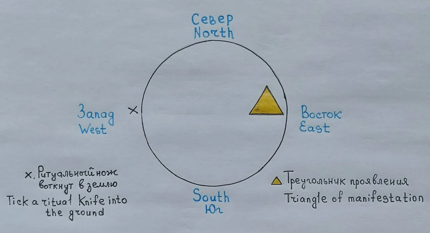 Освященным мелом или другим освещенным средством, рисуем Магический круг. Первые 108 раз вызова, рисуем для того, чтобы запомнило подсознание. Можно мело , можно насыпать кристаллический песок, можно вычертить ножом на песке, на земле, выткать на ковре, нарисовать на белой ткани синей краской и т.д. После 108 раз, магический круг можно создавать ментально.