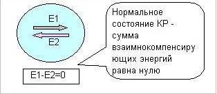 При этом, из КР высвобождается определенное количество свободной энергии. Величина этой энергии определяется временем приложения силы возмущения и ее величиной. То есть сила возмущения является своеобразным «вентилем» к трубопроводу энергии бесконечной мощности, открытие которого производит отток от основной магистрали. При устранении силы возмущения баланс энергий мгновенно восстанавливается. Реально существующее малое перетекание энергий между камерами, ячейками КР, подобно току холостого хода трансформатора, или работе автомобиля на холостом ходу. Этот минимальный расход энергии необходим для поддержания стабильной работы устройства, которое готово в любой момент времени к выдаче полной мощности. Эта энергия расходуется на собственное жизнеобеспечение работающего устройства.