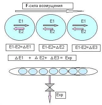 говорится о составляющей физического вакуума – фитоне, который содержит два кольцевых пакета, вращающихся в противоположных направлениях, правый и левый спин. Первоначально они скомпенсированы и суммарный момент их вращения равен нулю. Поэтому и вакуум себя никак не проявляет. При приложении определенной, силы, имеющей большую торсионную составляющую, в любой точке КР, и имеющую такую величину, которая сможет вывести из состояния равновесия несколько близь расположенных ячеек, может произойти разбалансировка энергий.