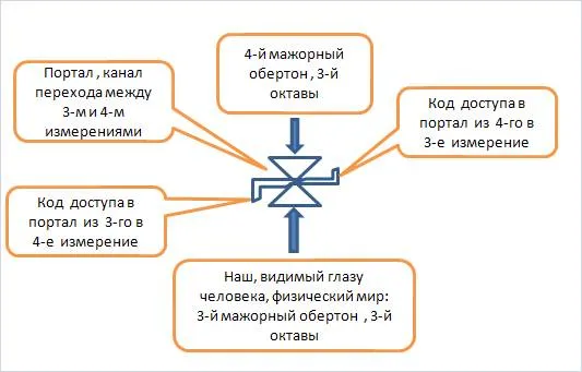 Портал между измерениями работает только в одном направлении. Его можно представить, как тиристор, который открывается, если на его управляющий электрод подать импульс на открытие. В этом случае тиристор открывается и проводит ток только в одном направлении. То есть, код доступа в портал при переходе из 3-его мажорного в 4-е мажорное измерение той же третьей октавы, будет один, но не факт, что при обратном переходе код будет тот же. Вероятно он будет другим. Переход в иные измерения других октав Розы Реальности Земли более сложен, так как требуется преодолеть большой барьер пустоты между октавами, а возможно и не один. Закручивание электромагнитного поля по спирали приводит к образованию энергетических вихрей.
