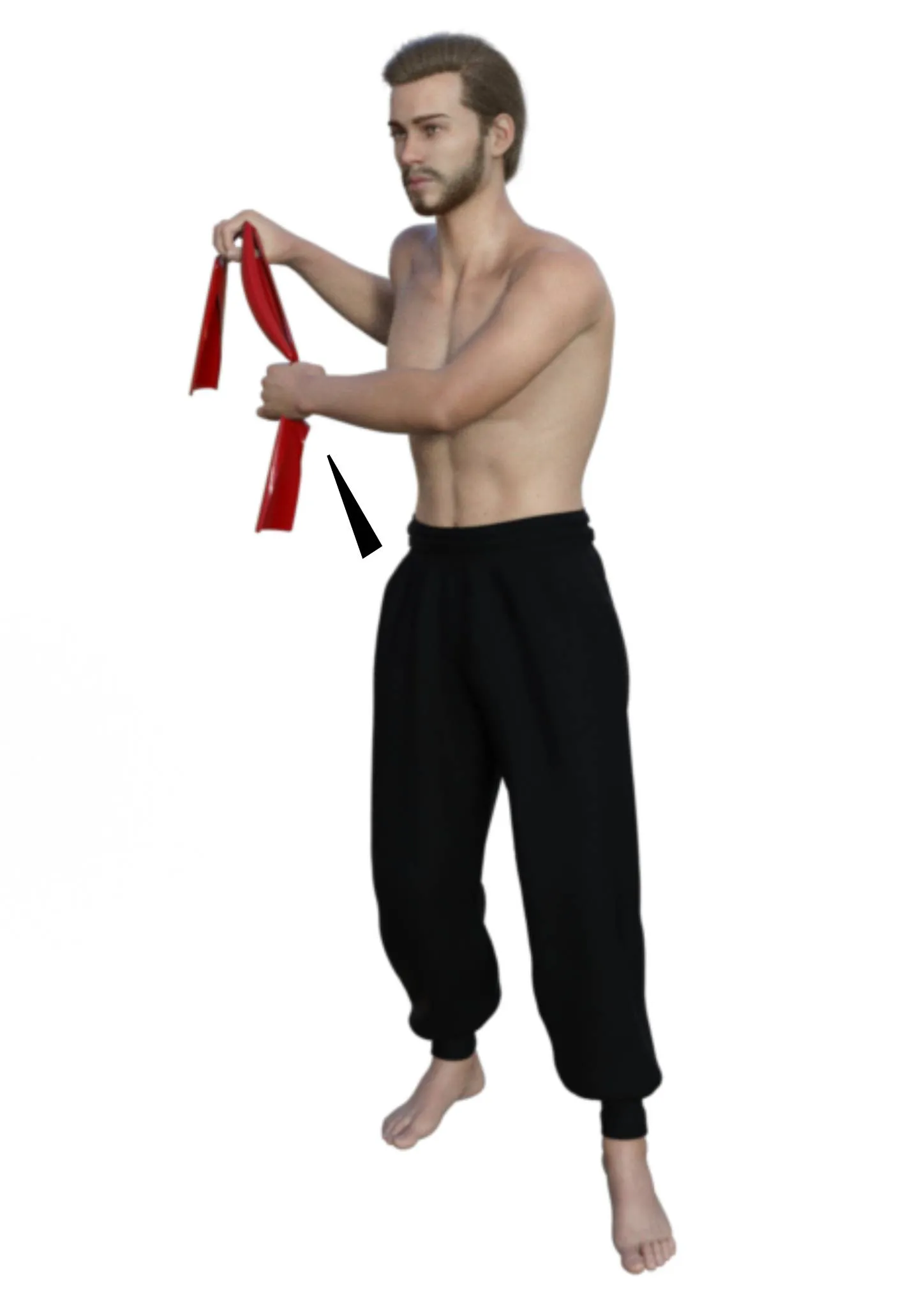 Продолжая первое движение, поднимите руки и еще больше поверните тело вправо, приподнимая левую пятку от земли.