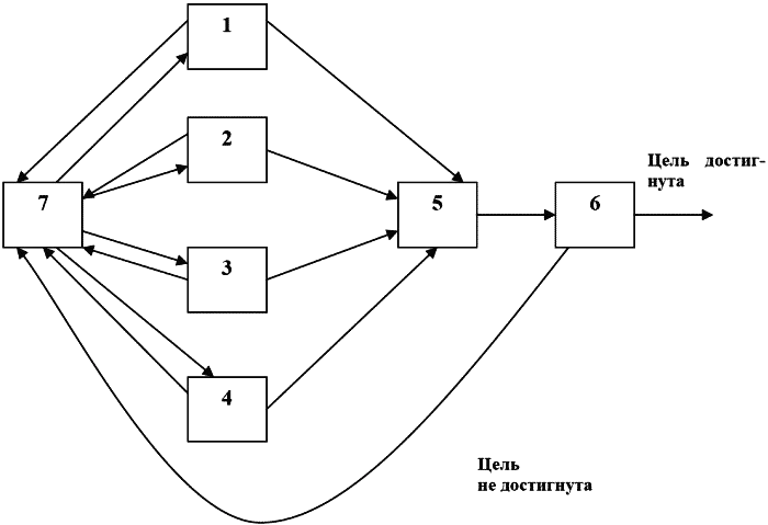 * Целенаправленная деятельность содержит циклы, что очевидно из рассмотренной модели. Известно, что такие структуры могут быть неустойчивыми, в таком случае процессы, осуществляемые в них, не приводят к достижению цели. Неустойчивость процесса является следствием неблагоприятного сочетания статических и динамических характеристик средств, используемых на каждом этапе. Синтез устойчивой структуры системы для реализации процесса достижения цели сам по себе является сложной задачей и с помощью практически применимых формальных правил решен для довольно узкого круга технических систем. В социальных, человеко-машинных и технических и др. системах, которые могут быть использованы для реализации процессов достижения целей, обеспечивающих устойчивое протекание процесса, должны решаться задачи, связанные с обеспечением различных качественных показателей упорядоченности, надежности и эффективности взаимосвязанных экономических, экологических и социальных систем.