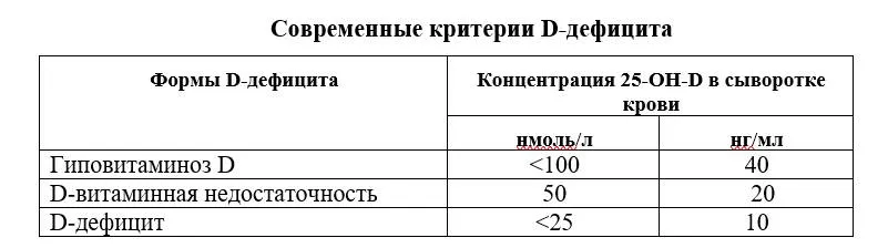 Показателем, отражающим статус витамина D в организме, является 25-гидроксивитамин D (25-OH-D). Это основной метаболит витамина D, присутствующий в крови. Значения 25-OH-D в интервале 30-100 нг/мл считаются нормой. Критерии D-дефицита представлены в табл. 3. В некоторых лабораториях подсчет осуществляется в альтернативных единицах – нмоль/л. Пересчет единиц осуществляется по формуле:
