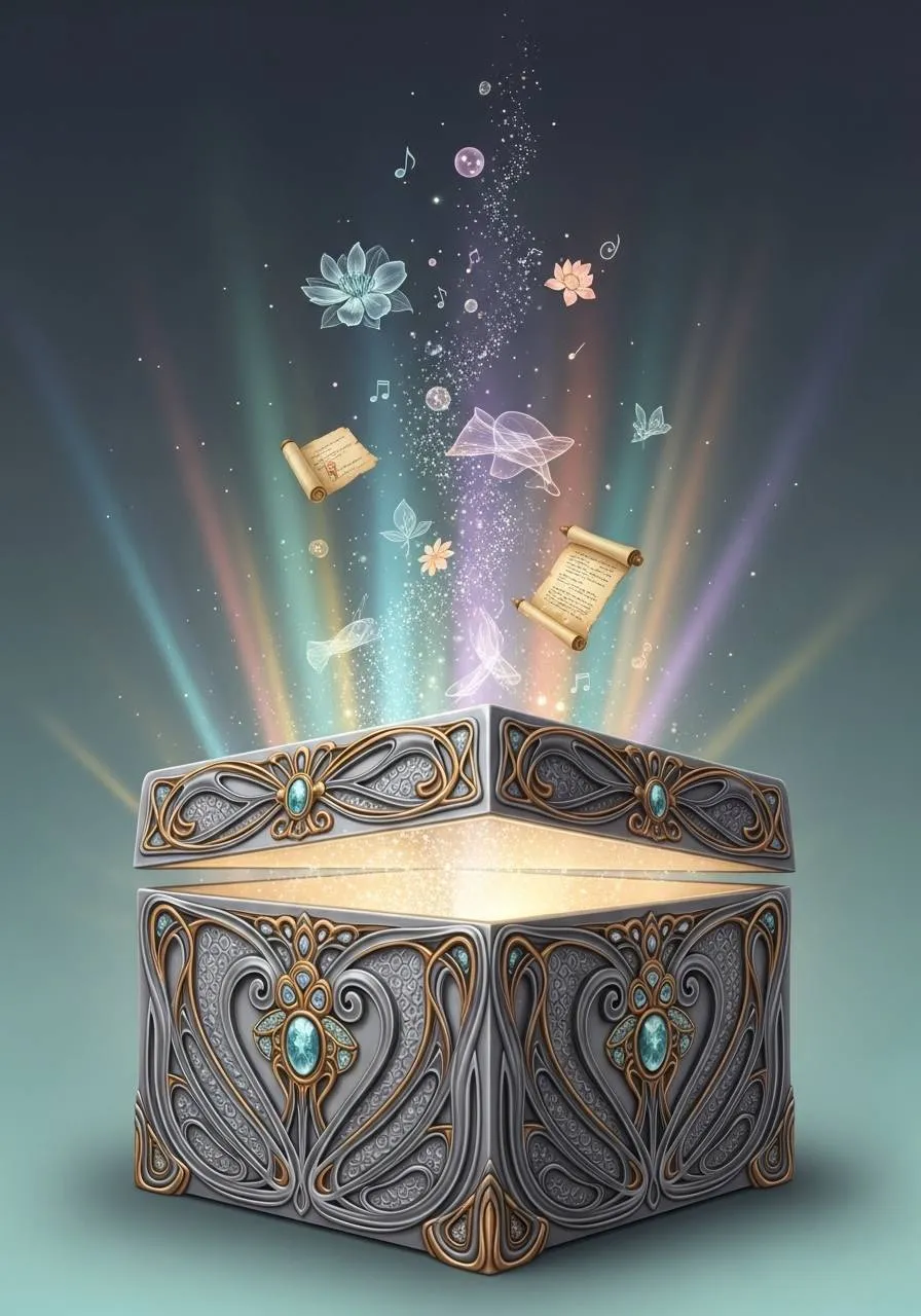 Эта шкатулка была покрыта серебром, хрусталём и тончайшими рисунками, которые менялись в зависимости от того, кто на неё смотрел. Творец видел в ней волшебный лес, музыкант – ноты таинственной мелодии, писатель – ожившие персонажи своих историй. Шкатулка обладала особой силой: тот, кто открывал её в состоянии тихой задумчивости, мгновенно ощущал прилив вдохновения и творческих сил, к нему приходили удивительные идеи и необычные образы.