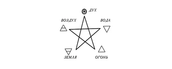 Дух стоит выше остальных Стихий, как духовный мир над материальным. Знаменитый символ перевернутой пентаграммы принято рассматривать как нечто сатанинское, но она лишь ставит четыре Стихии над Духом. Это можно толковать как подавление духовного материальным, но основное значение такого символа – нисхождение Духа в материю, одушевление материального мира. Леви объявил перевернутую пентаграмму символом козла – Сатаны, но не смотря на это перевернутая пентаграмма служила личной печатью римскому императору-христианину Константину, причисленному к лику святых, а сейчас порой украшает витражи католических церквей и православные иконы. Это похоже на ситуацию с перевернутым распятием, которое тоже относят к числу «сатанинской» символики, хотя это крест Святого Петра, один из уважаемых христианских символов, украшающий престол Папы Римского. Возможно, решение Леви объявить перевернутую пентаграмму сатанинским символом было одной из тех многочисленных ловушек, которые разбросаны по книгам о магии, что еще раз ставит под сомнение достоверность информации, оставленной Леви.