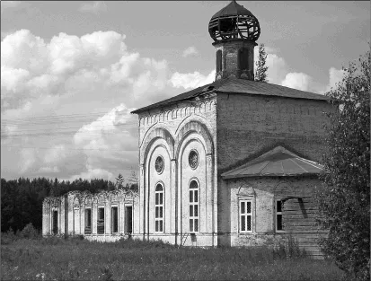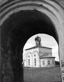 Иду дальше. Вот и старое сельское кладбище по левую руку. За ним чуть поодаль белеет церковь с разрушающейся кровлей и проржавевшими куполами. От ограды уцелели лишь красивые полуразрушенные столбы старинных ворот.
