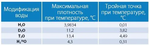 Физические свойства разных изотопных модификаций воды при различных температурах:117
