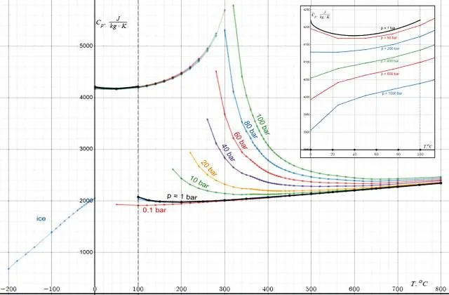 Теплоёмкость льда, воды, и водяного пара при различных давлениях