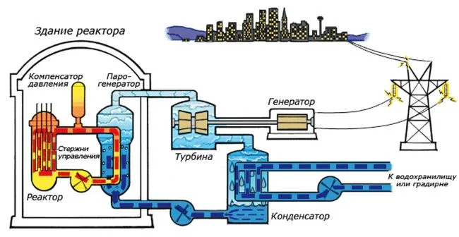 Схема работы атомной электростанции на двухконтурном водо-водяном энергетическом реакторе (ВВЭР)
