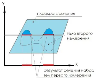 Сечением тела второго измерения является либо прямая, либо набор прямых как тел первого измерения.