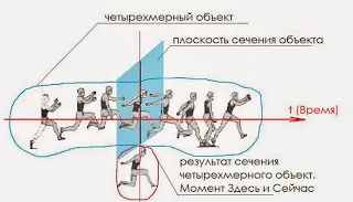 Сечением тела четвертого измерения является тело третьего измерения (к примеру, состояние нашего тела или тела Вселенной) в моменте Здесь и Сейчас (рис. 5,6).