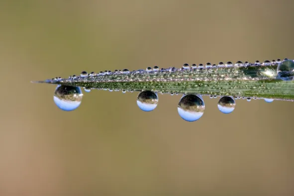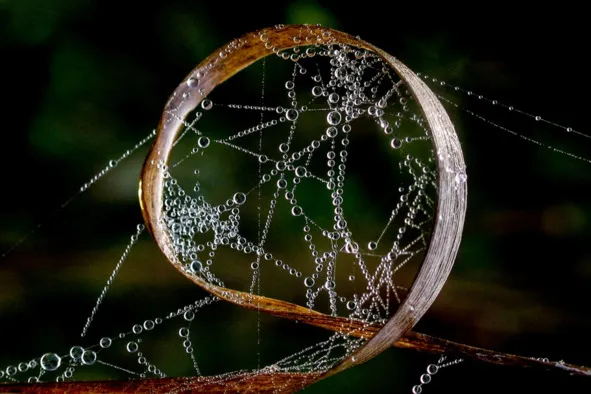 Однако в земной природе есть огромное количество минерала, который поэты не без оснований называют живым. Это вода. Вода бежит, струится, плещет и бьётся, падает с неба струями дождя. Гёте в стихотворении «Песнь духов над водами» даже сравнил её с тем, что античные философы считали самой сущностью жизни человека – его душой. Вода не имеет формы за исключением случая, когда это капли росы, за счёт поверхностного натяжения приобретающие форму шариков (рис. 1). Цепочки «планет» можно в таком случае наблюдать осенним утром на паутине (рис. 2).