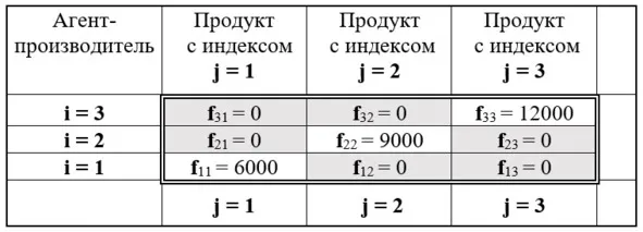 Наконец, действительными числами fij обозначим заданное количество производства продуктов j-го вида i-ым агентом-производителем. При этом, согласно начальным условиям, структура потребления продуктов каждого из агентов-потребителей равна структуре производства, а объёмы потребления каждого из агентов равны между собой. Само распределение производства продуктов между агентами-производителями дано в форме матрицы на рисунке 12.