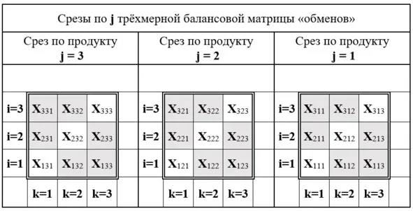 Для удобства восприятия матрица изображена в виде трёх вертикальных фронтальных срезов. Каждый из срезов отображает частную плоскостную двухмерную матрицу «обмена» по одному из j-ых видов продуктов между i-ыми и k-ыми агентами воспроизводственного процесса действительной жизни этого общества.