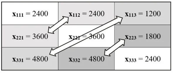 Меновые отношения для элементов xijk изменились и не соответствуют отношениям в структуре производства, которая осталась прежней – 2: 3: 4. Искомые меновые отношения на балансовой матрице «производство-потребление» рисунка 17 отмечены двухсторонними фигурными стрелками. Это следующие меновые отношения (&-знак менового отношения, меновой пропорции):