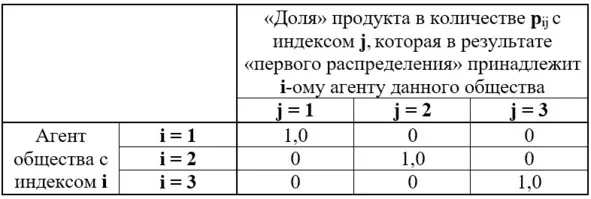 Тогда распределение произведённых продуктов между агентами-производителями, то есть их принадлежность этим агентам как владельцам, будет определяться матрицей, которая в табличной форме представлена на рисунке 3.