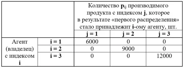 То есть в результате распределения первый агент-производитель (индекс i = 1) получает то, что произвёл, то есть 6000 штук продукта с индексом j = 1. Второй агент-производитель (индекс i = 2) получает то, что произвёл, то есть 9000 штук продукта с индексом j = 2. Третий агент-производитель (индекс i = 3) получает то, что произвёл, то есть 12000 штук продукта с индексом j = 3. Это распределение в табличной форме воспроизведено на рисунке 3.
