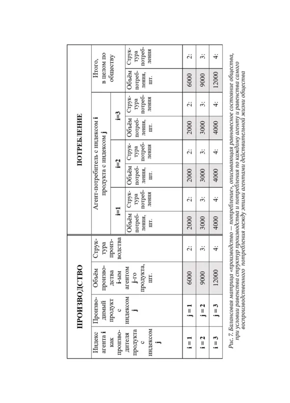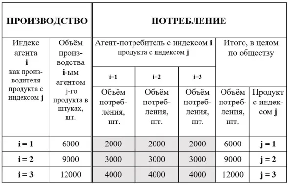 С учётом этого упрощения, высказанного абзацем выше, балансовая матрица «производства и потребления», описывающая равновесное состояние для одного цикла (кругооборота) воспроизводственного процесса действительной жизни общества, полностью повторяет те численные значения объёмов производства, которые приведены в матрице рисунка 5 «Производство – Приобретение…» и выделены тонированием соответствующих ячеек матричной таблицы. В результате получим следующую балансовую матрицу «производства и потребления» для рассматриваемого условного примера, которая представлена на рисунке 7.