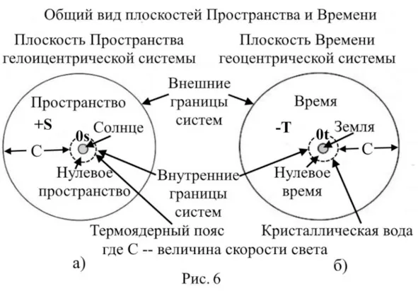Аналогичное строение имеет геоцентрическая система Птолемея в плоскости отрицательного Времени, показанная на рисунке 6б. Она будет зеркальным отображением гелиоцентрической системы Коперника. Эта система находится в плоскости Времени, имеющей внешнюю и внутреннюю границы. За внутренней границей, которой является пояс кристаллической воды, времени более нет. Здесь находится его нулевой центр с внутренним пространством этой системы. В нём располагается пространственная планета Земля. Отношение величин между внутренней и внешней границами обоих систем будет кратно скорости света С.