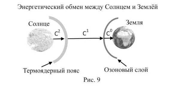На рисунке 9 изображена передача энергетических частиц времени от Солнца к Земле. Внутри термоядерного пояса из планеты Солнце, пока предположим это, испускается энергия времени со скоростью частиц С2. Попадая в термоядерный пояс, который представляет собой внутреннюю границу перехода из времени в пространство, эти частицы тормозятся до скорости света С1, отдавая часть своей энергии этому поясу и становясь корпускулами пространственного света, который мы уже можем видеть. Это торможение энергетических частиц времени вызывает процесс горения огня в термоядерном поясе. Далее они через космос уже корпускулами света достигают озонового слоя планеты Земля или любой другой планеты. В нём происходит ещё одно торможение частиц. Здесь они из корпускул становятся частицами пространственной материи, уже имеющих единичную скорость С0. Другого способа преобразования частиц энергии времени в материю пространства в гелиоцентрической системе мы более не наблюдаем.