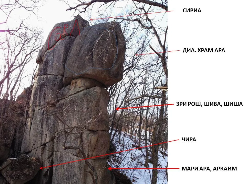 Это мегалиты маршрута «Сторожевой город» возле посёлка Первостроителей Приморья России. На этих камнях написано о Дии – Земле, знаком которой является крест, заключённый в круг. А также о Роше – князе Руси, Шиве – создателе Вселенной, Марии (сбоку видна женская голова в кокошнике), Аркаиме. Есть слово «Чира», «чирий» (в смысле, выступ) на нижнем камне слева, есть такая река Чир в России и несколько населённых пунктов по миру с корнем «чир» в названии. Фигуры, похожие на каменные, нашлись на рельефе около Чира-Юрт Чеченской республики. Посмотреть на них вы сможете на спутниковых картах в Интернете. Привести их в книге не имею права, поэтому показываю рисунок с рельефа: