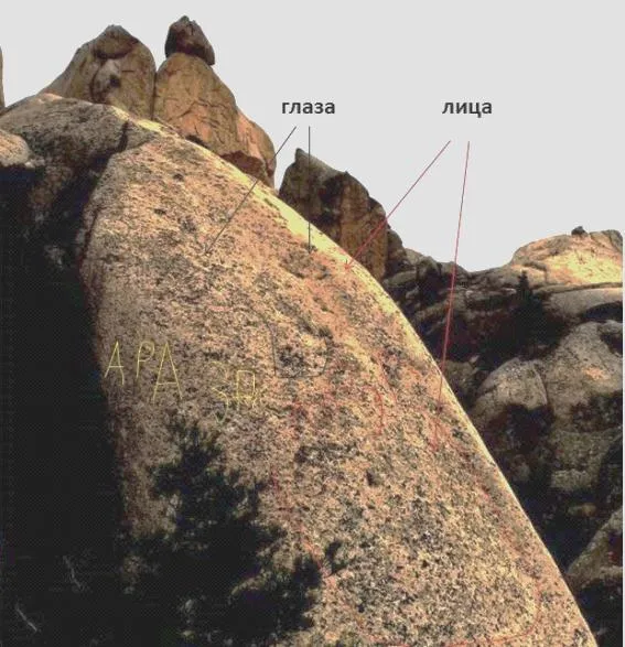 Здесь написано: «Храм Кама (любимый)». Ещё Кам – название древнего Тибетского государства (Википедия) в границах теперешних Монголии и Китая. А здесь на камнях сидит птица, ниже выбиты лица: