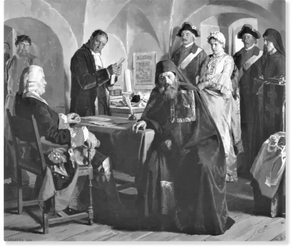 Начальник Тайной канцелярии А. С. Ушаков допрашивает княжну Юсупову в присутствии священнослужителя. Худ. Н. В. Неврев (1886 год).35
