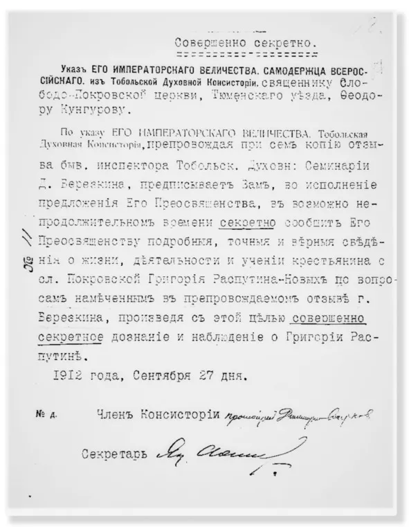Совершенно секретный «Указъ ЕГО ИМПЕРАТОРСКАГО ВЕЛИЧЕСТВА, САМОДЕРЖЦА ВСЕРОССИЙСКАГО изъ Тобольской Духовной Консисторiи» о секретном дознании и наблюдении за Григорием Распутиным «1912 года, Сентября 27 дня».