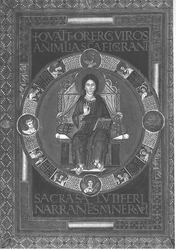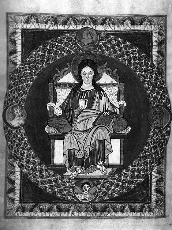 5а. Христос во славе. Лоршское Евангелие (Алба-Юлия, Batthyaneum lib. Codex aureus, f. 36r), рубеж VIII–IX вв.