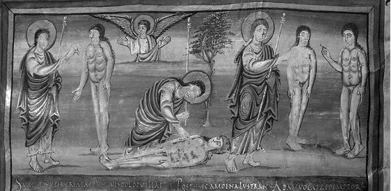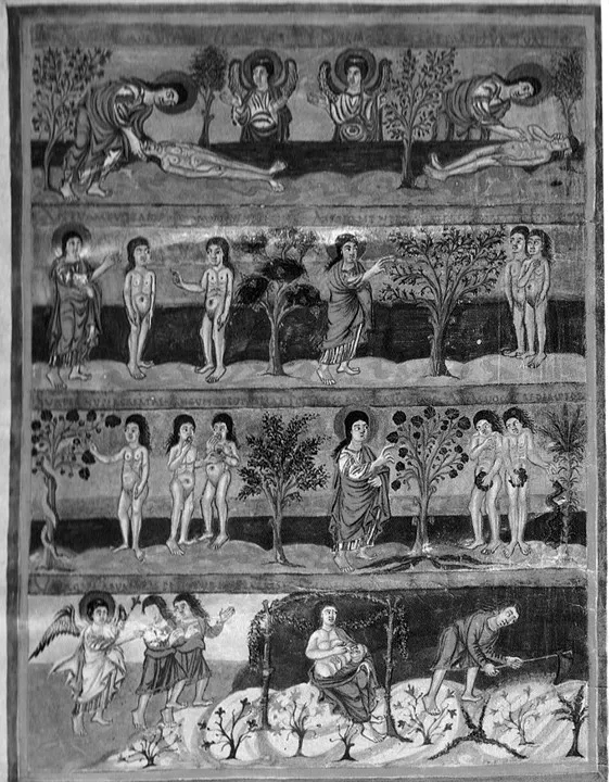 Чтобы проиллюстрировать этот тип заимствований, мы снова вернемся в каролингскую эпоху и обратимся к фронтисписам так называемых Турских Библий176: Бамбергской Библии (Bamberg, Staatliche Bibliothek, Msc. Bibl. I (A. I.5; илл. 8а); Библии из Мутье-Грандваль (London, Br. L., Add. 10546; f. 5v, 20); Библии Вивиана или Карла Лысого (Paris, B. n., lat. 1; илл. 8б) и Библии Сан-Паоло-фуори-ле-Мура (Roma, San Paolo fuori le mura; f. 7v, 21) середины IX века. Фронтисписы к книге Бытия в этих четырех рукописях дают нам пример четырех вариантов сокращения предполагаемого цикла-образца, который сам уже неоднороден и восходит к нескольким традициям. На неоднородность источников указывает и то, что сам многорегистровый фронтиспис – новая форма, сложившаяся в турской школе каролингской миниатюры в результате видоизменения неизвестного нам предыдущего варианта.