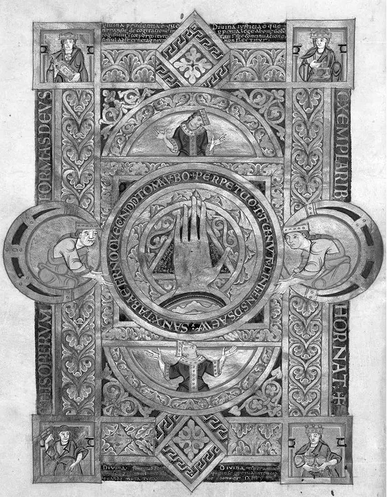 10. Десница в окружении персонификаций добродетелей. Евангелиарий аббатисы Уты (Munich, Bayerische Staatsbibliothek, Clm 13601, f. 1v), первая четв. XI в.