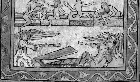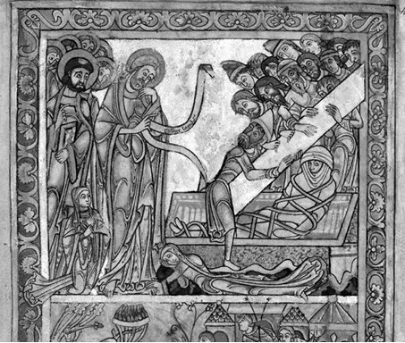 13а. Воскрешение Лазаря (Винчестерская Псалтирь, Br. L., Cotton MS Nero C IV, f. 19r) 1140–1160 гг.