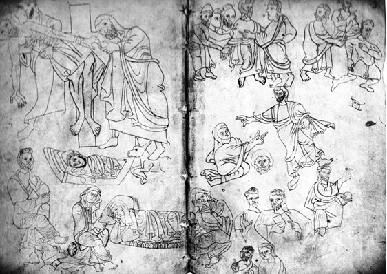 Недавнее масштабное исследование еще одного примера этого типа – так называемых Вольфенбюттельских листов (Wolfenbuttel, Herzog August Bib., Cod. Guelf. 61.2 Aug. 8, f. 75r–94v, 1230–1240 гг., 58), предпринятое Л. Жеймона243, – открыло новый этап в дискуссии о назначении такого рода рукописей. Тетрадь из 20 листов вшита в более позднюю рукопись, непосредственно поверх рисунков нанесен текст. Разные по полноте трактовки части новозаветных сцен на 12 листах иконографически восходят преимущественно к византийским памятникам, а стилистически связаны с распространением в первой половине XIII века так называемого Zackenstil (в связи с этим в качестве места изготовления рукописи называются как Саксония, так и Венеция244). Восточный тип иконографии ряда сцен – Воскресения, Преображения, Моления о чаше, Оплакивания – позволяет говорить о том, что зарисовки задуманы как способ ознакомить западного мастера с восточными иконографическими изводами. Ни один лист не содержит целостной композиции; речь, как и во Фрайбургском листе, идет о центральном ядре сцены или об отдельной фигуре, причем части разных сцен могут совмещаться на одной странице. В ряде случаев (как на f. 78r; илл. 14б) композиция оказывается разъятой на две части, совмещенные в разном масштабе на одном листе: верхняя часть Преображения с фигурами Христа и пророков совмещена с крупной фигурой Петра, обращающегося к Христу, из нижней части той же композиции. Л. Жеймона на этом и ряде других примеров убедительно показывает245, что мастер сознательно отказывается от воспроизведения сцены целиком, прибегая к своего рода «мнемоническим приемам», стремясь скопировать наиболее важную часть композиции на уровне отдельного мотива. Голова пророка Илии, повторенная в более крупном масштабе на сгибе того же бифолия, свидетельствует о том, что листы использовались изначально не как тетрадь, а как отдельные «тренировочные» feuilles volantes и лишь позже были сброшюрованы. Подробный иконографический анализ дает возможность найти параллели композициям как в византийской миниатюре, так и в монументальной живописи. Однако при отсутствии подписей и частом дроблении сцены на разномасштабные фрагменты-мотивы трудно предположить, чтобы кто-то, кроме самого мастера, мог воспользоваться этими зарисовками (да и он сам по прошествии времени сделал бы это с большим трудом). Обобщая все эти данные, Л. Жеймона делает вывод о том, что Вольфенбюттельские листы – своего рода «заметки путешественника», traveling sketchbook246. Последующая судьба листов, вскоре после исполнения рисунков вшитых в чужеродную рукопись и исписанных поверх абсолютно независимым текстом, служит поводом для предположения, что мастер вовсе не предназначал свои зарисовки для наставления учеников или молодых коллег по скрипторию и создавал их как своего рода «пробы пера» или зарисовки для тренировки памяти. Более того, исследователь настаивает на том, что в ряде случаев мастер не понимал смысла изображенного и просто фиксировал увиденное247.